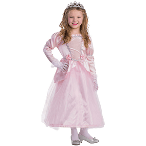 This classic pink Princess costume dress is every little girls dream. Be the most beautiful princess in this gorgeous pink dress. This elegant, pink and white gown and crown combination will make any child the prettiest princess in the land. The princes costume features satin look skirt that has a pink tulle overlay and a peplum on top. Top of the dress is accented with flowers, silver trimming and has mutton sleeves. Pink gown has a Velcro closure in the back and a hoop at the bottom.
