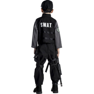EVERY LITTLE KID DREAMS OF BEING A HERO; NOW HE CAN! The zip-up jacket has lots of pockets with snap closures. S.W.A.T. is written on the jacket and cap. Belt comes with a buckle for easy and comfortable closure and includes pouches with leg straps. The pants feature an elastic waistband for a comfortable fit. The set is packaged in a durable zippered garment bag.